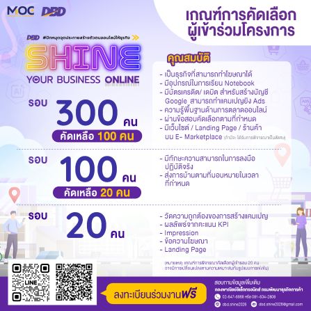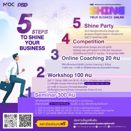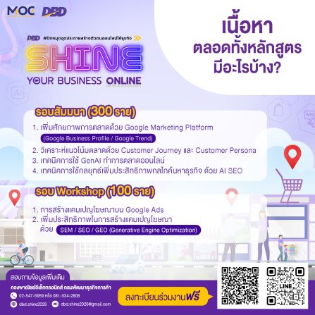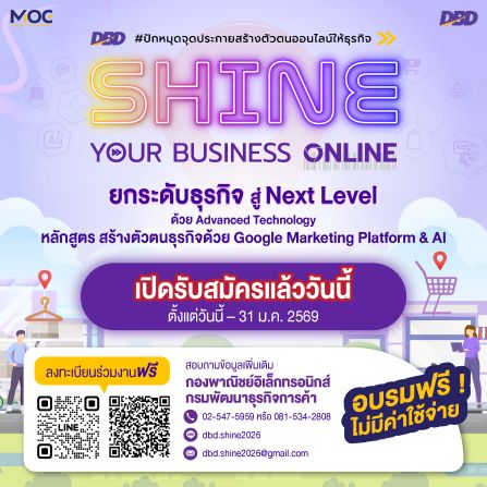 กรมพัฒนาธุรกิจการค้า เดินหน้าจัดกิจกรรม ‘SHINE YOUR BUSINESS ONLINE #ปักหมุดจุดประกายสร้างตัวตนออนไลน์ให้ธุรกิจ’ ปีที่ 2 (SHINE Season 2) เสริมทักษะเทคโนโลยี การตลาดออนไลน์แบบเข้มข้น ครบทั้งสัมมนา เวิร์กช็อป และโค้ชชิ่งเชิงลึก เพื่อปั้นผู้ประกอบการไทยสู่แนวหน้า พร้อมสร้างตัวตนบนโลกออนไลน์ด้วย Google Platform ตลอดจนเสริมการใช้ AI เป็นเครื่องมือเพิ่มประสิทธิภาพการตลาดธุรกิจดิจิทัล สมัครได้แล้วตั้งแต่วันนี้-31 มกราคม 2569 หรือจนกว่าที่นั่งจะเต็ม